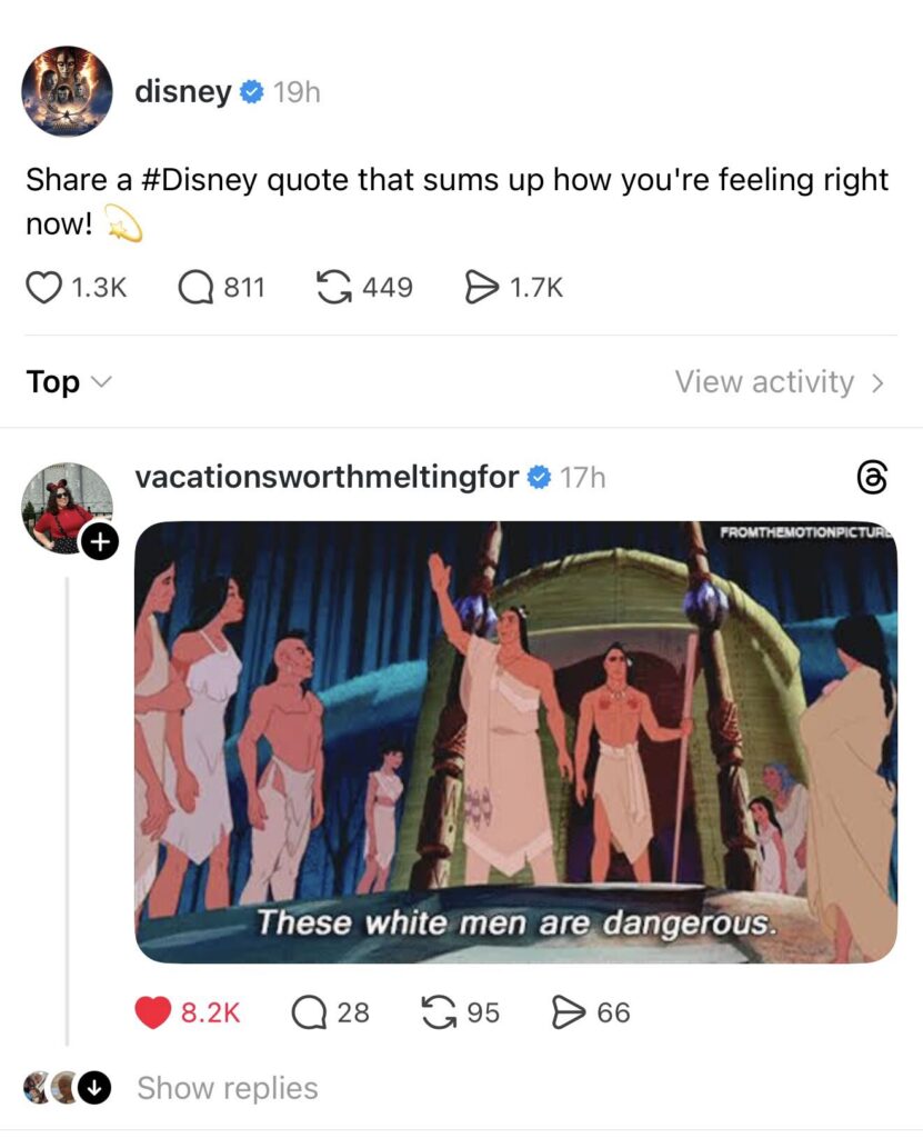 According to multiple users who documented the responses before the deletion, one of the most-liked replies featured Pocahontas lyrics. The responses were, as one Threads user put it, a “brilliant collection of antifascist cinematic moments.”