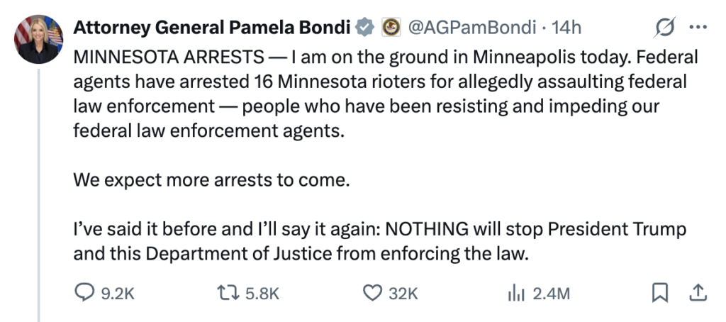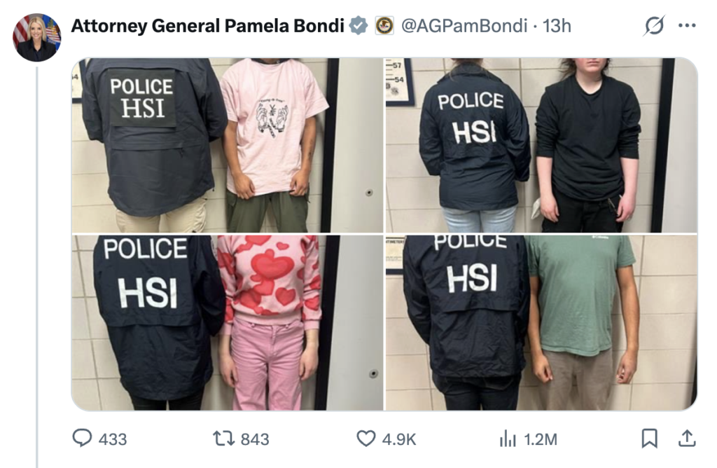 Here’s the thing: DOJ policy explicitly prohibits releasing mugshots of people charged with federal crimes unless it serves a “legitimate law enforcement function.” Bondi’s posts served no such purpose. They were designed to do one thing: scare people out of protesting.