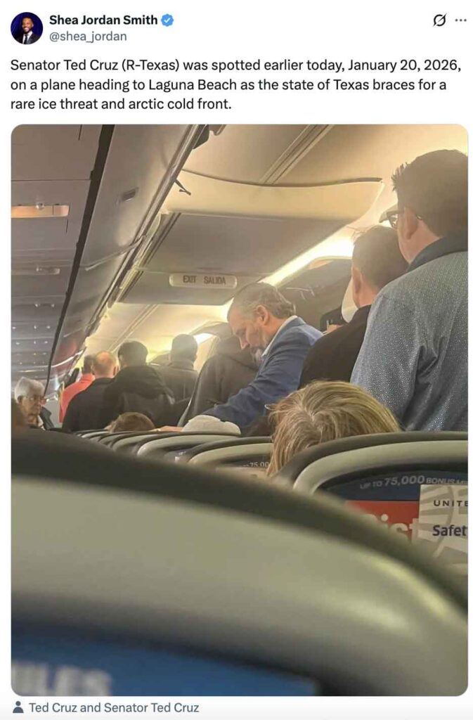 The Texas senator was photographed on a flight to Southern California on January 20th, just days before a major winter storm is set to pummel his home state. Political strategist Shea Jordan Smith spotted Cruz on the plane and posted the evidence to X.