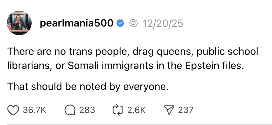 You’ve probably seen the viral posts floating around social media: “No trans people or drag queens in the Epstein files!” It’s become a sort of triumphant rallying cry, a way to throw conservatives’ moral panic back in their faces.