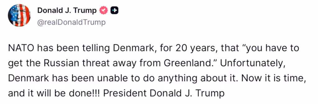 “This is a very dangerous situation for the Safety, Security, and Survival of our Planet,” Trump wrote, apparently without irony, about his own plan to destabilize transatlantic relations over an island he cannot legally purchase.