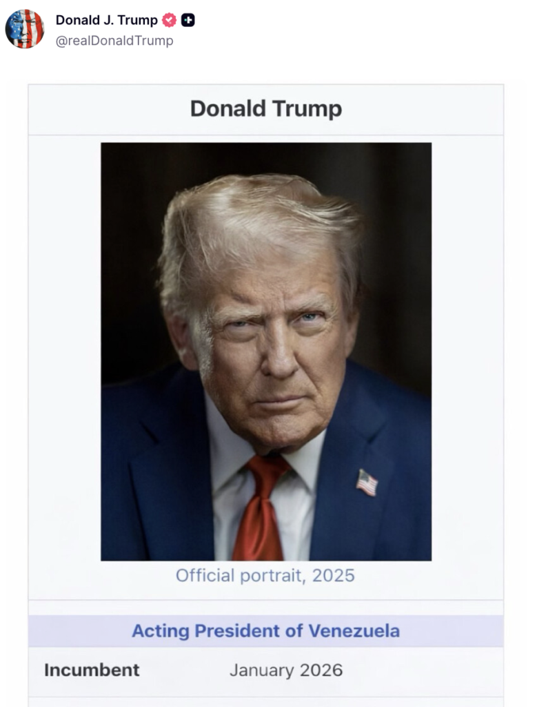 On Sunday, Trump posted a mock Wikipedia-style image on Truth Social declaring himself Venezuela’s leader as of January 2026. The timing tracks: earlier this month, he sent the U.S. military into Venezuela without Congressional approval to kidnap President Nicolás Maduro and drag him to New York for trial on drug trafficking charges.