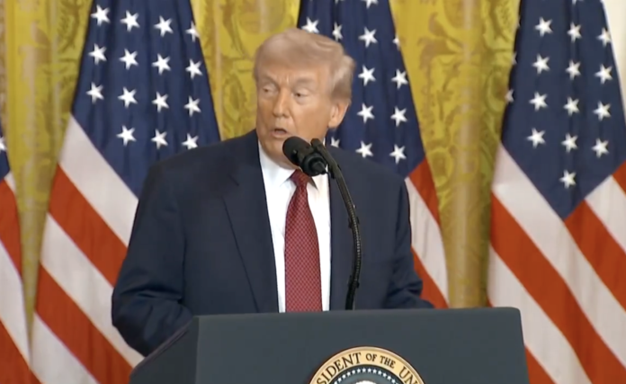 Donald Trump, 79, slurred and stammered his way through what should have been a straightforward announcement at the White House on Wednesday, muttering unintelligible gibberish mid-sentence before appearing to completely lose his train of thought.